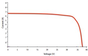 Let’s begin with some basic electronic theory. The power of any electrical device is the current flow multiplied by the voltage. Note that current flow is written as ‘I’ but measured as ‘amps’ – confusing we know). In our case, the electrical device is a solar panel and the power it produces is measured in watts. But due to changing weather fluctuations, the power or watts that a panel produces is not fixed. As weather changes – for example, when shade hits the panel – the voltage generated by the panel will decrease. Because ‘V’ multiplied by ‘I’ = Power, this means that as the voltage reduces, so too will the current flow or amps. The amount of amps that can be produced by any given voltage is determined by a graph called an IV curve. These will be found on any solar panel’s specification sheet and typically looks like this:
