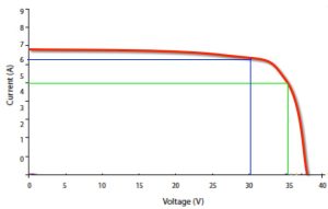 In the graph below, the blue line shows a voltage of 30V which corresponds to a current of about 6.2 amps. This produces power of 186 watts (30v x 6.2a = 186w). The green line shows a Voltage of 35V which corresponds to a current of 5A. This produces power of only 175 watts (35v x 5a = 175w). As you may have noticed, as you move along the red curve you will find one point where the Voltage multiplied by its corresponding current is higher than anywhere else on the curve. This is called the solar panel’s Maximum Power Point (MPP) & is the place where we will find the most power.