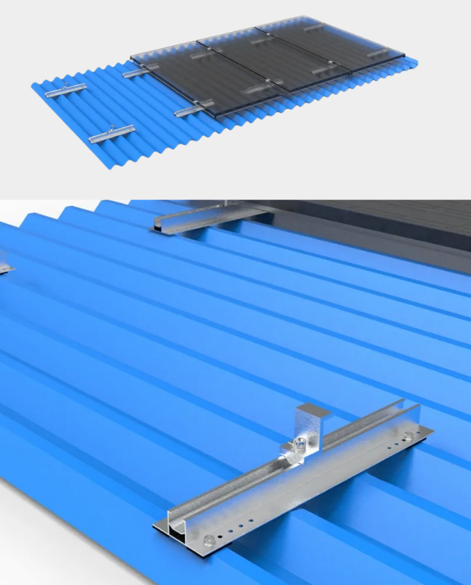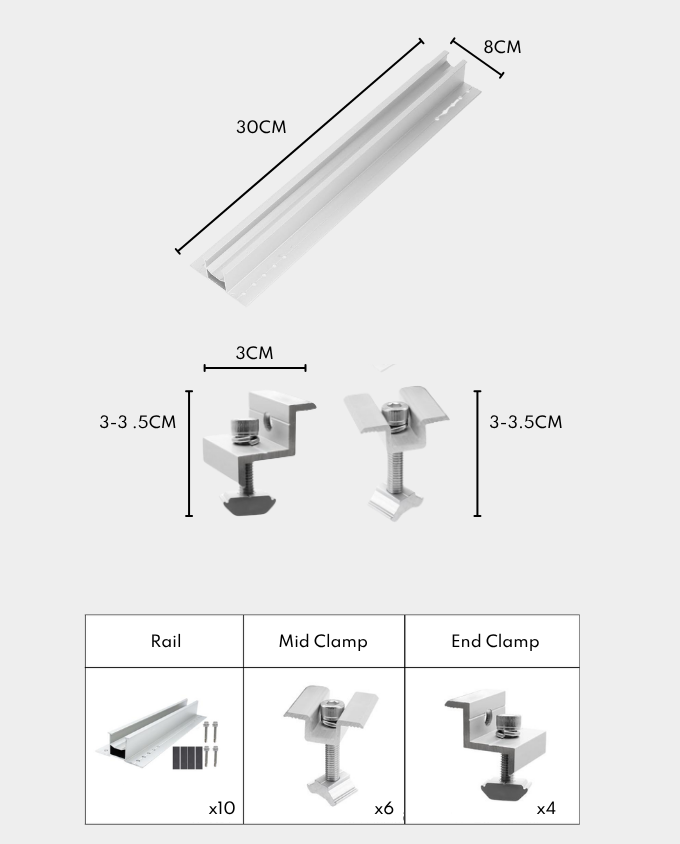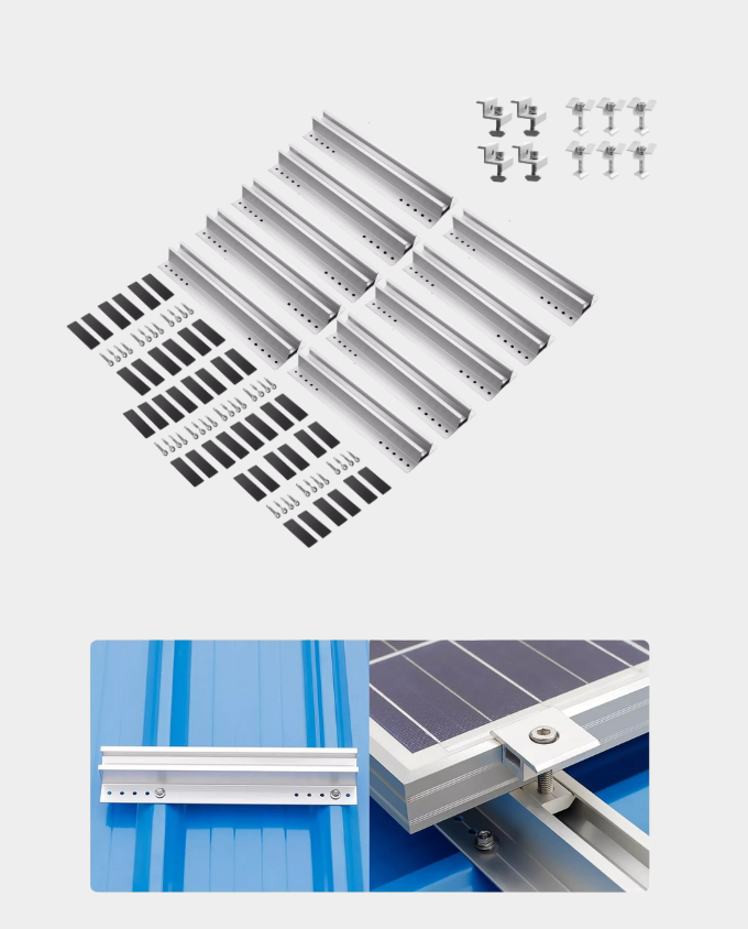 Easy way to fit solar panels to flat roofs, corrugated sheets, or trapezoidal metal roofing, often found on sheds, garages, cabins, and outbuildings. This kit includes 10 aluminium rails, all fixings, and waterproof rubber pads. No need to drill into the panel frame, the system creates a solid and weatherproof base.
